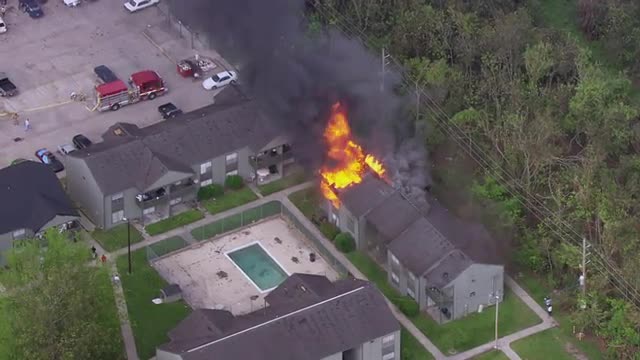 MS POV AERIAL ZO Firefighter extinguishing fire / United States