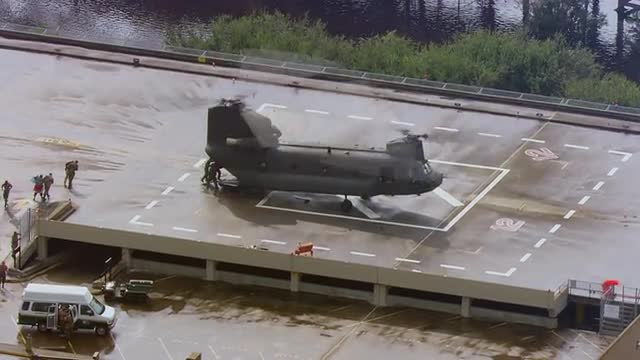 > MS POV AERIAL TS Old woman being rescued by rescue worker / United States
