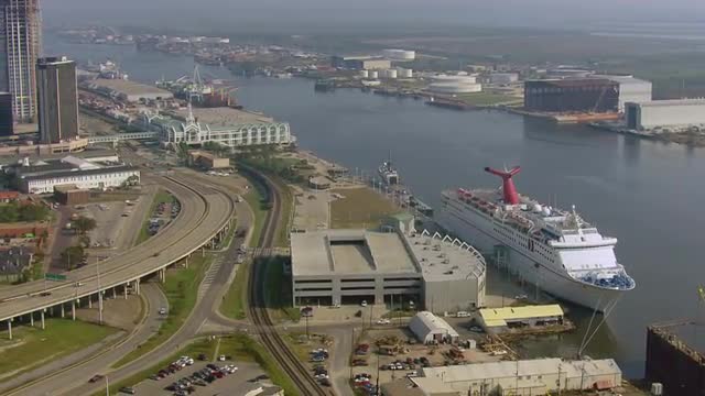 WS POV AERIAL View of shipyard and oil refinery / United States