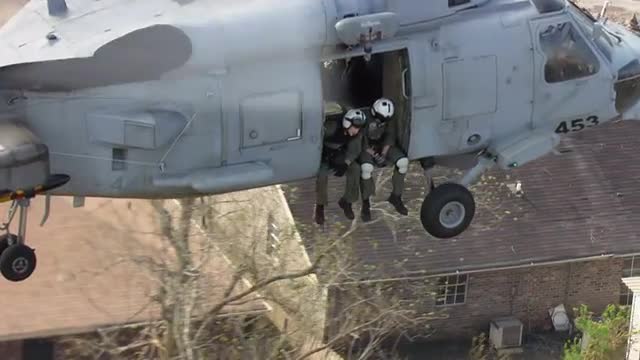 > MS POV AERIAL TS ZI Helicopter hovering over destructed town / United States