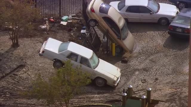 > MS POV AERIAL ZO Cars onto fence lines near destructed area / United States