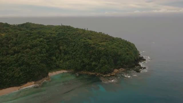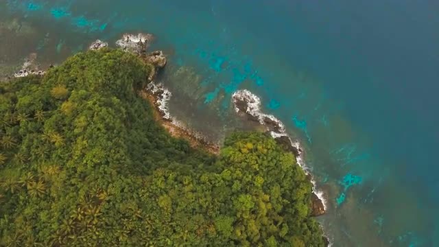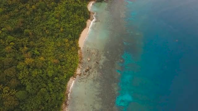 Aerial view of beautiful tropical island with sand beach. Tropical lagoon with turquoise water and yellow sand. Seascape: Ocean and a beautiful beach paradise. Beautiful view of a nice tropical beach from the air. Philippines, El Nido. 4K video. Travel concept. Aerial video tropical beach from above. Aerial footage.