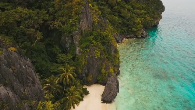 Wild beautiful beach with coconut palms. Tropical bay in El Nido. Aerial view: bay and the tropical island. Aerial video. Sky and mountains rocks. Tropical lagoon with turquoise water and white sand. Seascape: mountains, ocean. Philippines, El Nido. 4K video. Travel concept. Aerial footage.