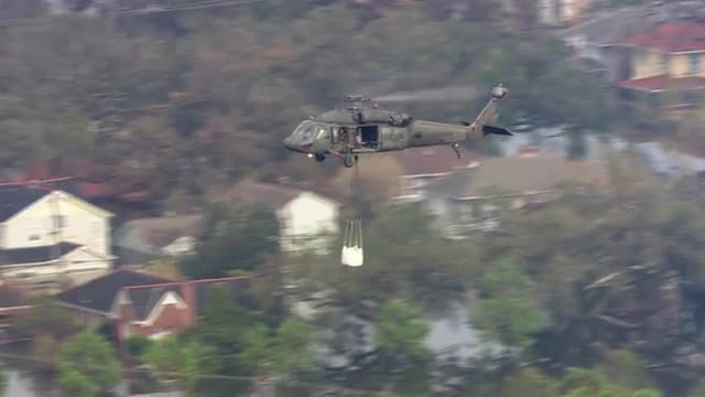 > WS POV AERIAL ZI ZO TS Helicopter carrying sandbag hovering over flooded area / United States