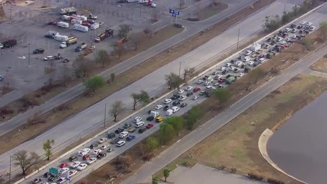 > WS POV AERIAL ZO Vehicles lined up on highway / United States