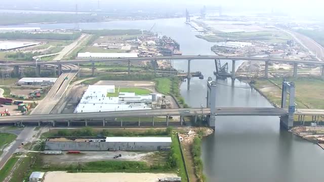 > WS POV AERIAL Convoy of military supply vehicles moving on causeway / United States