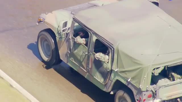 > WS POV AERIAL View of American flag waving at army beach camp near shoreline / United States
