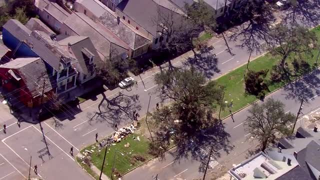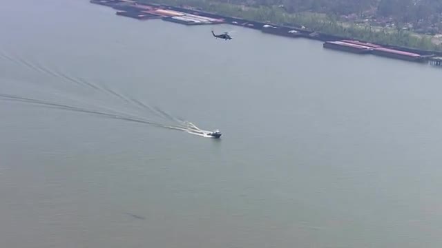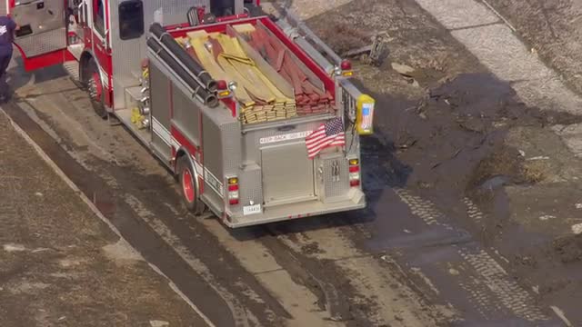 > MS POV AERIAL TS ZO Vehicle along with soldiers moving in flooded water / United States