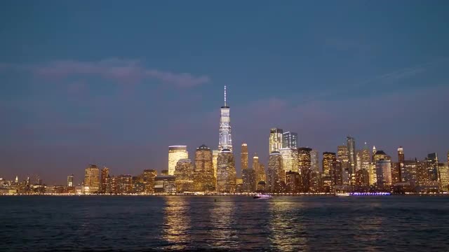 > new york city sunset light hudson river walking bay freedom tower view 4k usa