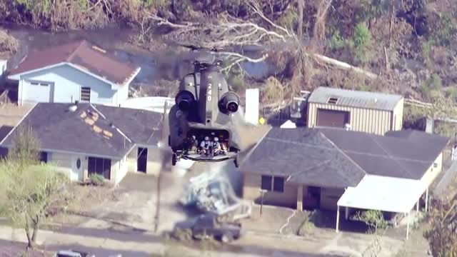 > WS POV AERIAL TS ZO Helicopter hovering with slingload net / United States