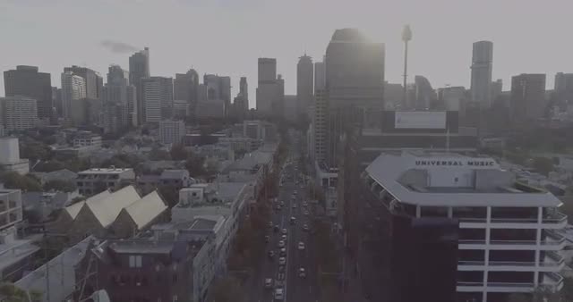 Birds eye view of William Street panning up to Sydney City. Sydney NSW Australia