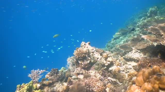 Fish and coral reef. Tropical fish on a coral reef. Wonderful and beautiful underwater world with corals and tropical fish. Diving and snorkeling in the tropical sea.Travel concept.4K video.