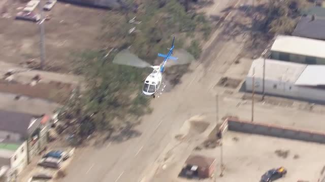 WS POV AERIAL TS ZO Helicopter hovering over destructed suburban area / United States