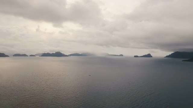 Tropical bay in El Nido. Aerial view: bay and the tropical islands. Tropical landscape. The bad, stormy weather on the island. Sky and mountains rocks. Aerial video. Seascape:sky, mountains, ocean.Philippines, El Nido. 4K video. Travel concept Aerial footage.