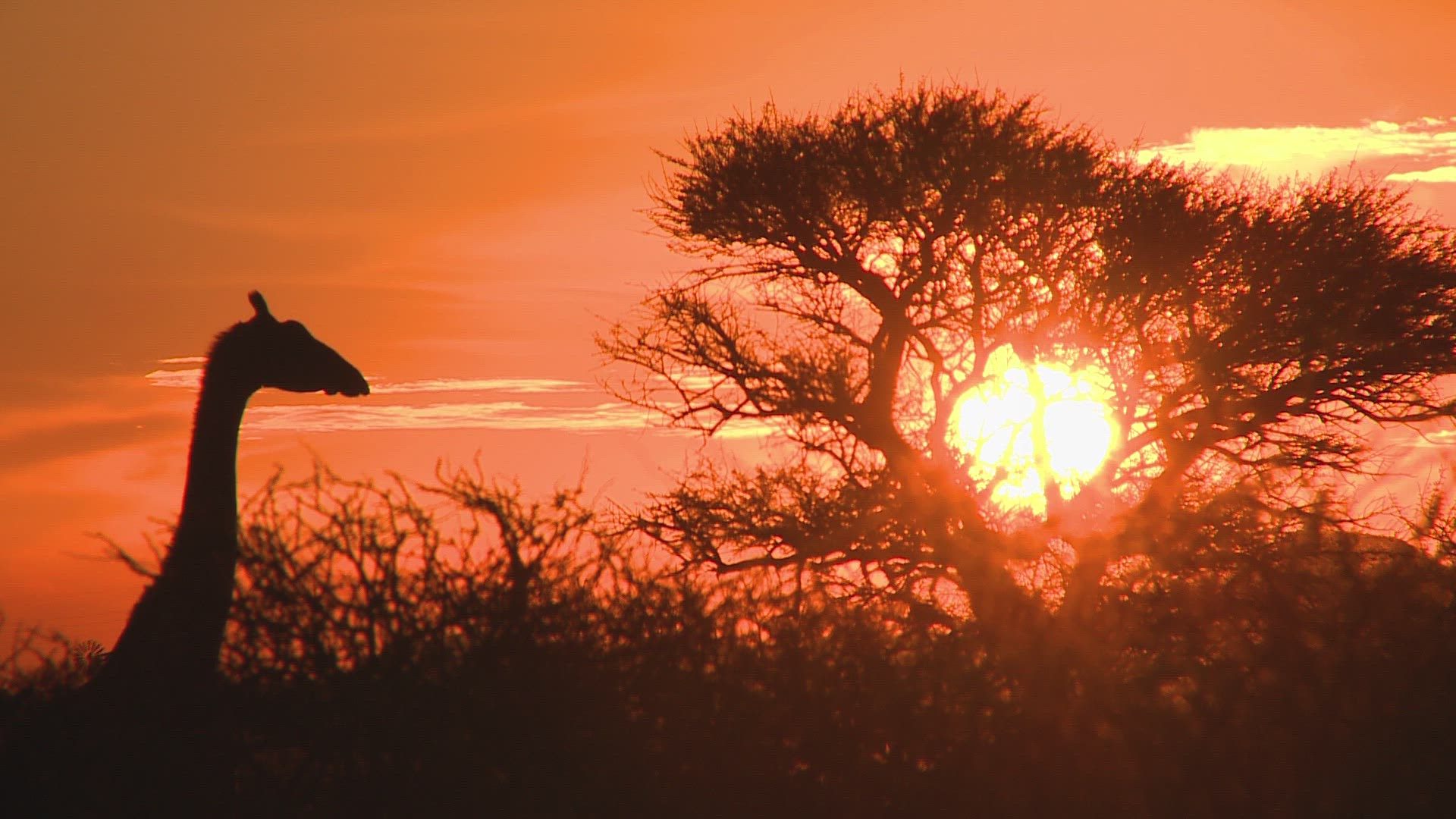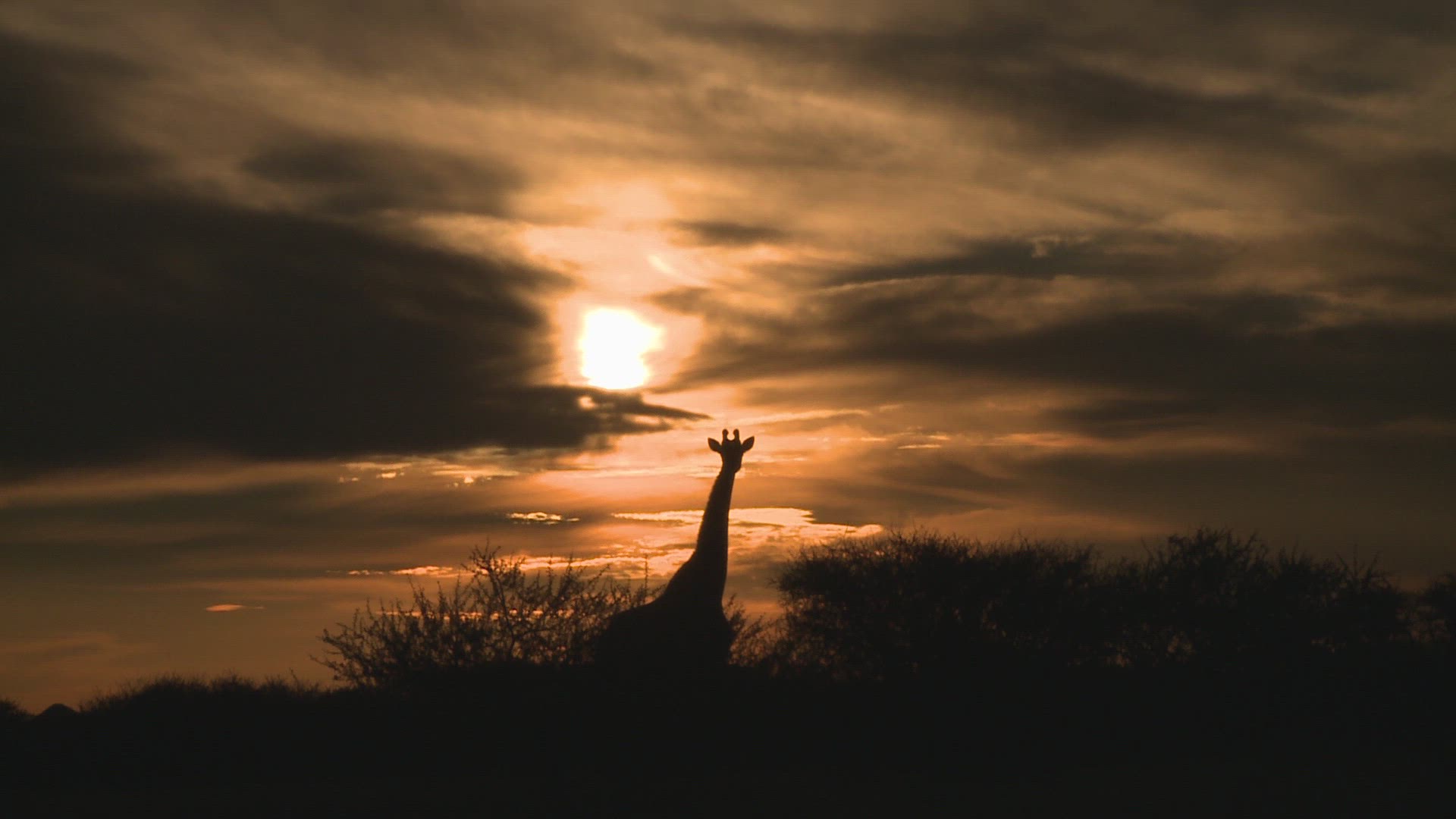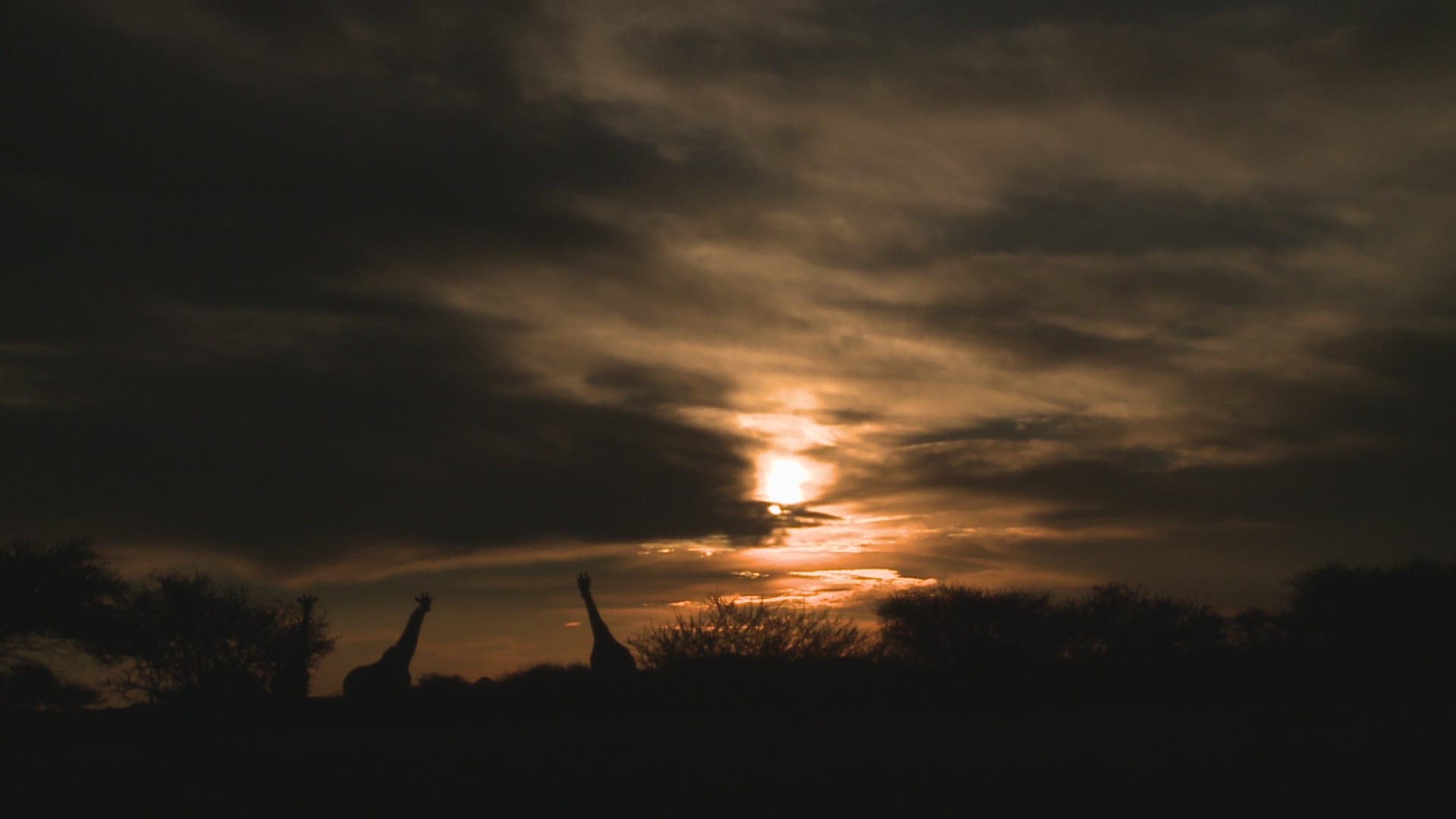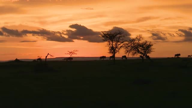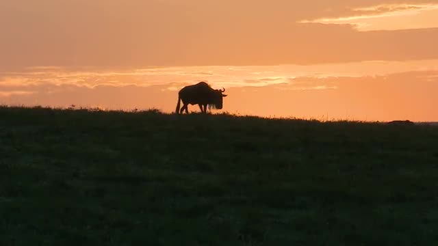 Wildebeest move along the horizon and an Impala runs while they are silhouetted against the morning sunrise.