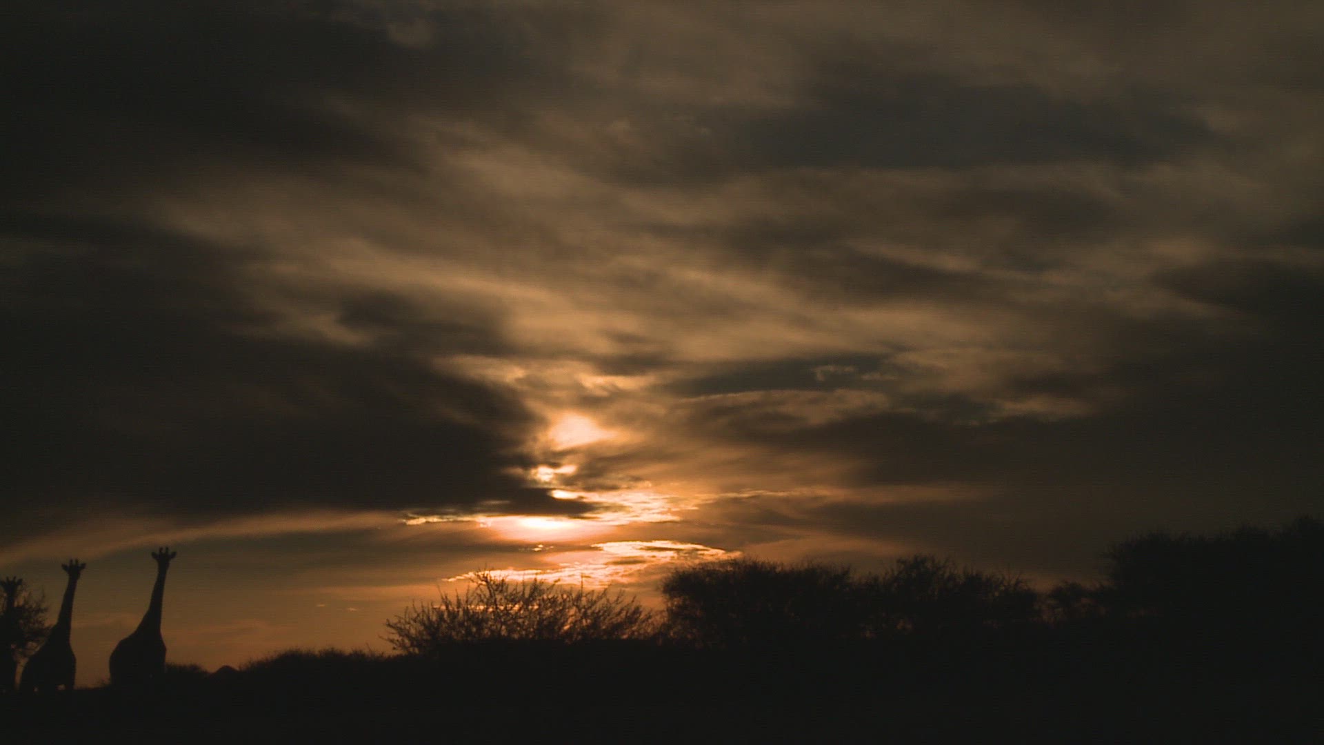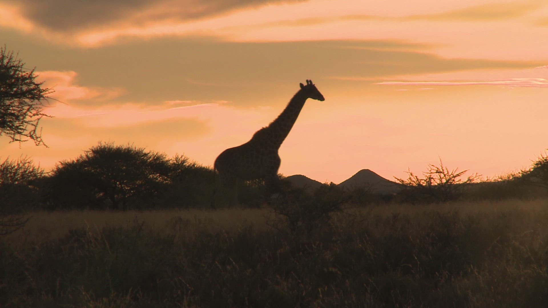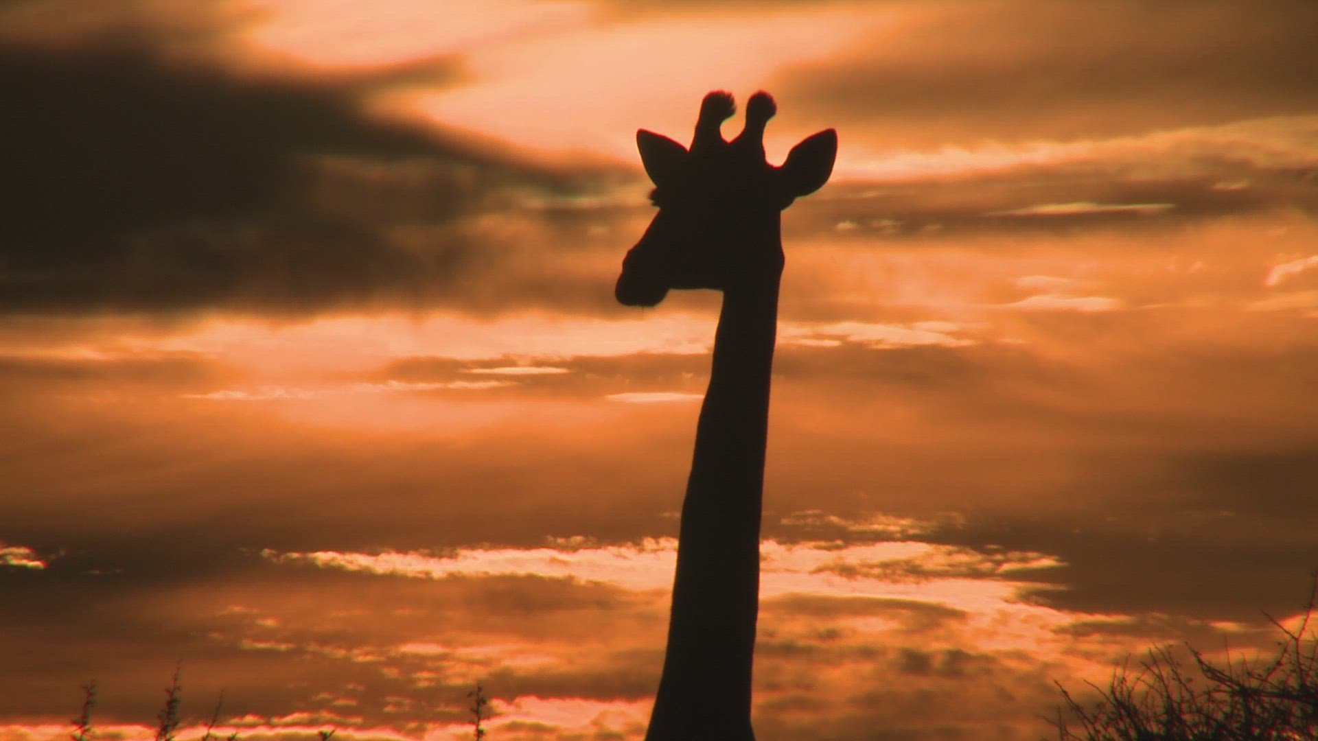 Wildebeest move along the horizon and an Impala runs while they are silhouetted against the morning sunrise.