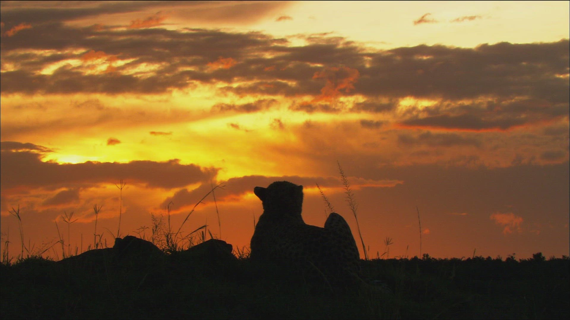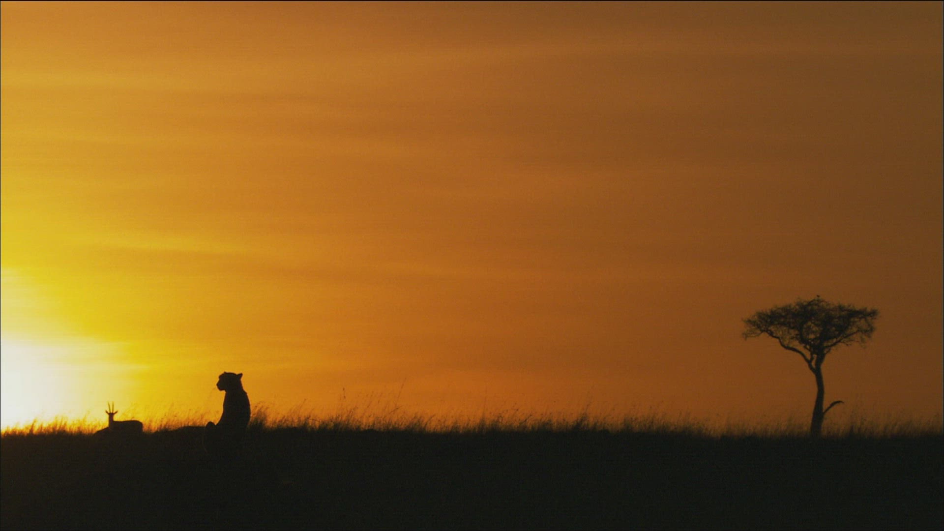 Wildebeest and impala move along the horizon and are silhouetted against the morning sunrise.