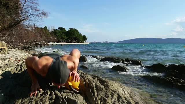 Man doing stretching exercise on the beach. Sporty Male Training And Exercising During Outdoor Workout At Beach. Fitness, Sports and active lifestyle.Sports, Healthy Active Lifestyle Concept. 4k video.