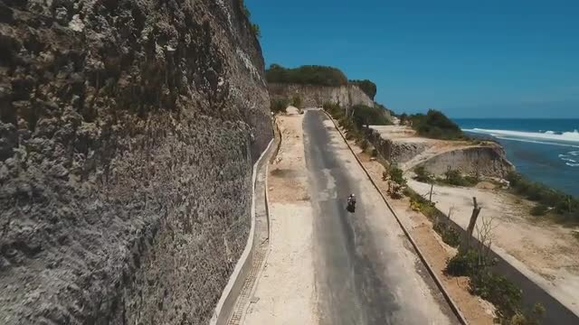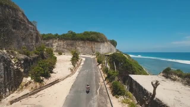 Man on a motorbike on the beach against the sea, the sky, clouds. Guy rides scooter in sunny day. Man in sunglasses driving a motorcycle at beach. 4K video, Philippines.
