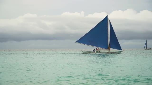 Sailing boat on sea. Sailing ship yachts with blue sails in the ocean. Sailing ship yachts in the sea. Philippines, Boracay. 4K video. Travel concept.