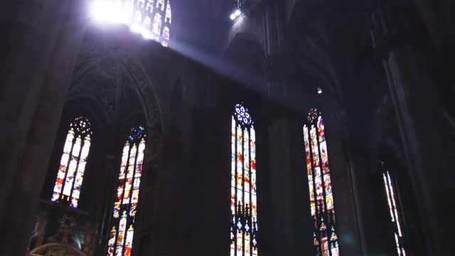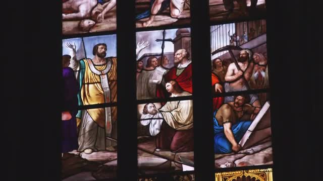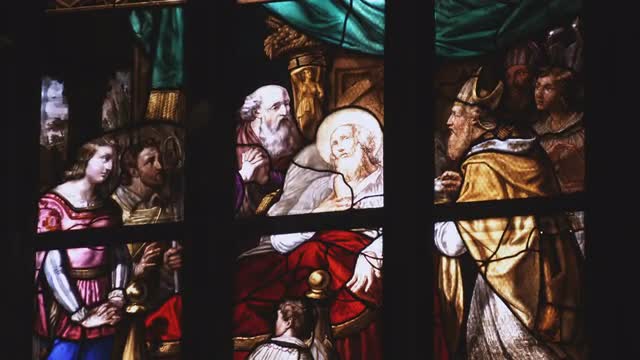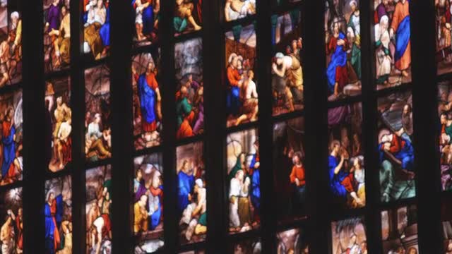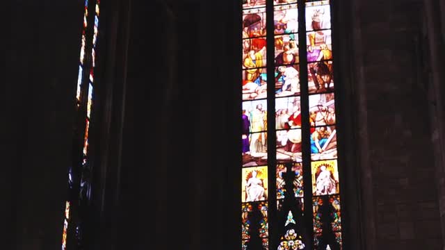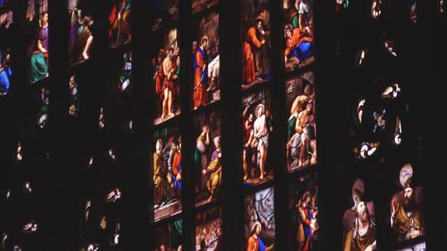 Multicolored stained glass church window illustrated Bible stories. stained glass windows with religious motifs. Manila Cathedral interior, Intramuros. 4K video, Philippines