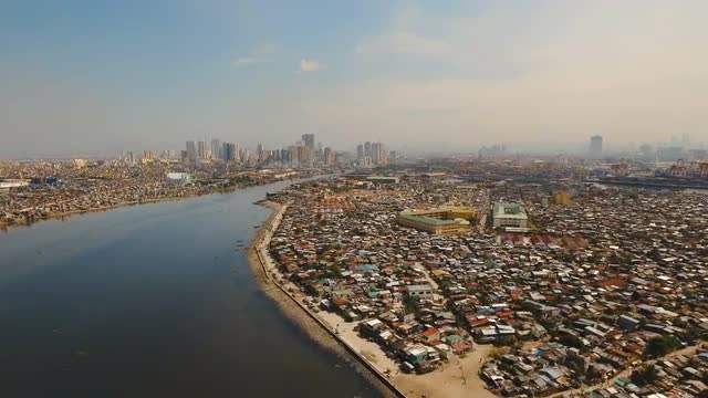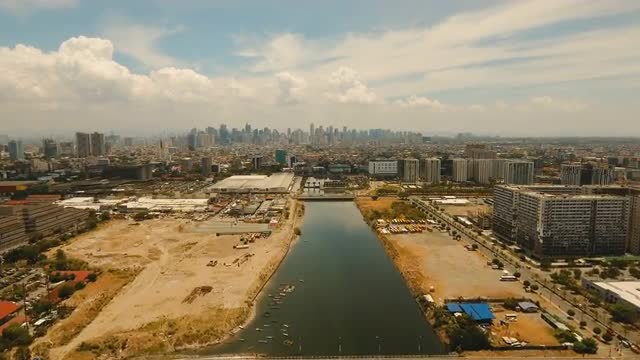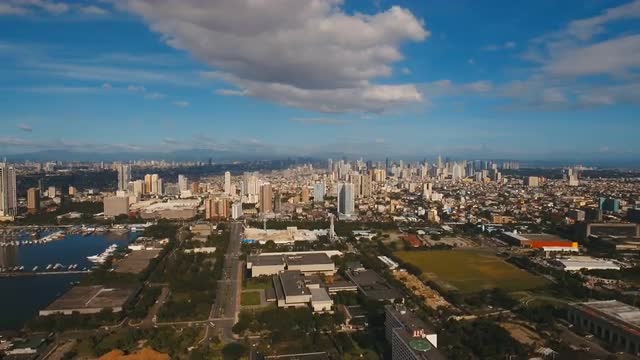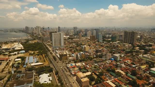 Manila city, skyscrapers and buildings. Seascape coastal city of Manila. Modern city by sea. Makati district. 4K video. Travel concept.