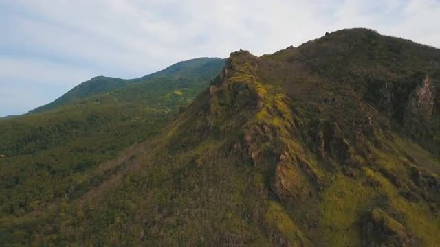 Rainforest covered with green vegetation and trees in the mountains on the tropical island. Aerial view: Mountains and hills with wild forest. Hillside rainforest and jungle. Mountains with sky clouds. Philippines, Camiguin. 4K video. Aerial footage