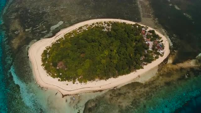Aerial view of beautiful tropical island Mantigue with white sand beach. Beautiful , sea, resort. Seascape: Ocean and beautiful beach paradise. View of a nice tropical beach from the air. Philippines, . 4K video. Travel concept. Aerial footage.