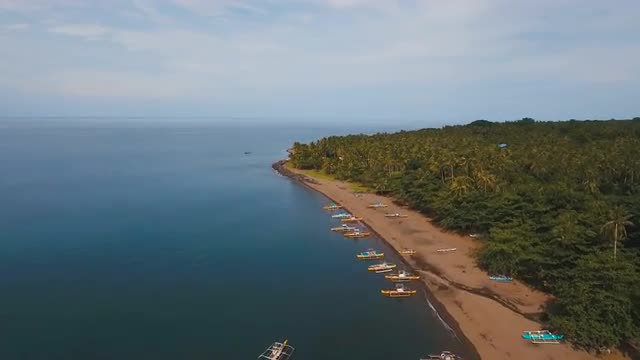 Aerial view coastline on tropical island with sea, trees, palms and ,sailing boat. Aerial footage.Aerial video from flying drone of amazingly beautiful landscape with volcanic sand beach, rain forest. Seascape: Ocean and sky.Aerial panoramic view of island coastline. Philippines, Camiguin. 4K video.Travel concept. Aerial footage.