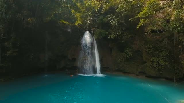 Beautiful waterfall in green forest in jungle. Tropical rain forest with waterfall.Waterfall with natural swimming pool in a mountain river canyon. Kawasan Falls. Philippines, Cebu. 4K video. Travel concept. Aerial footage.