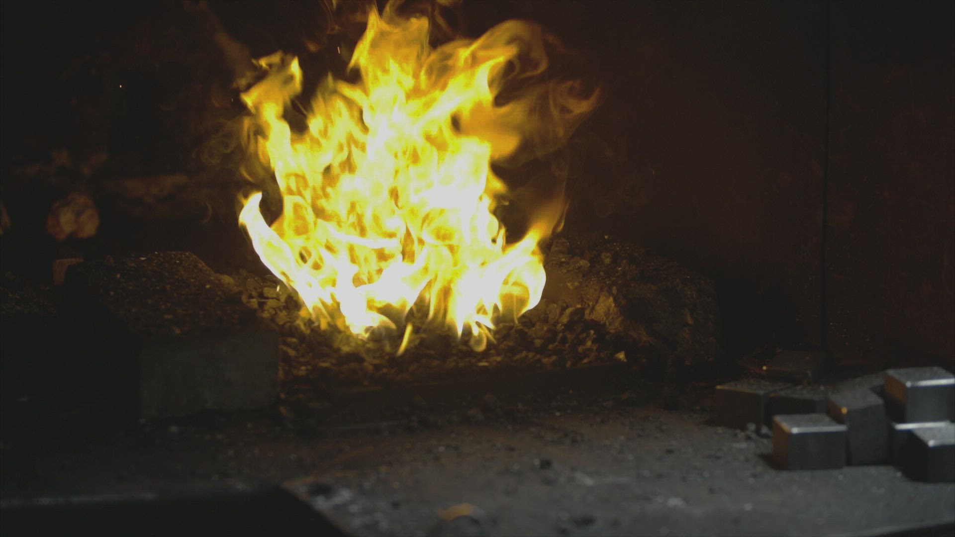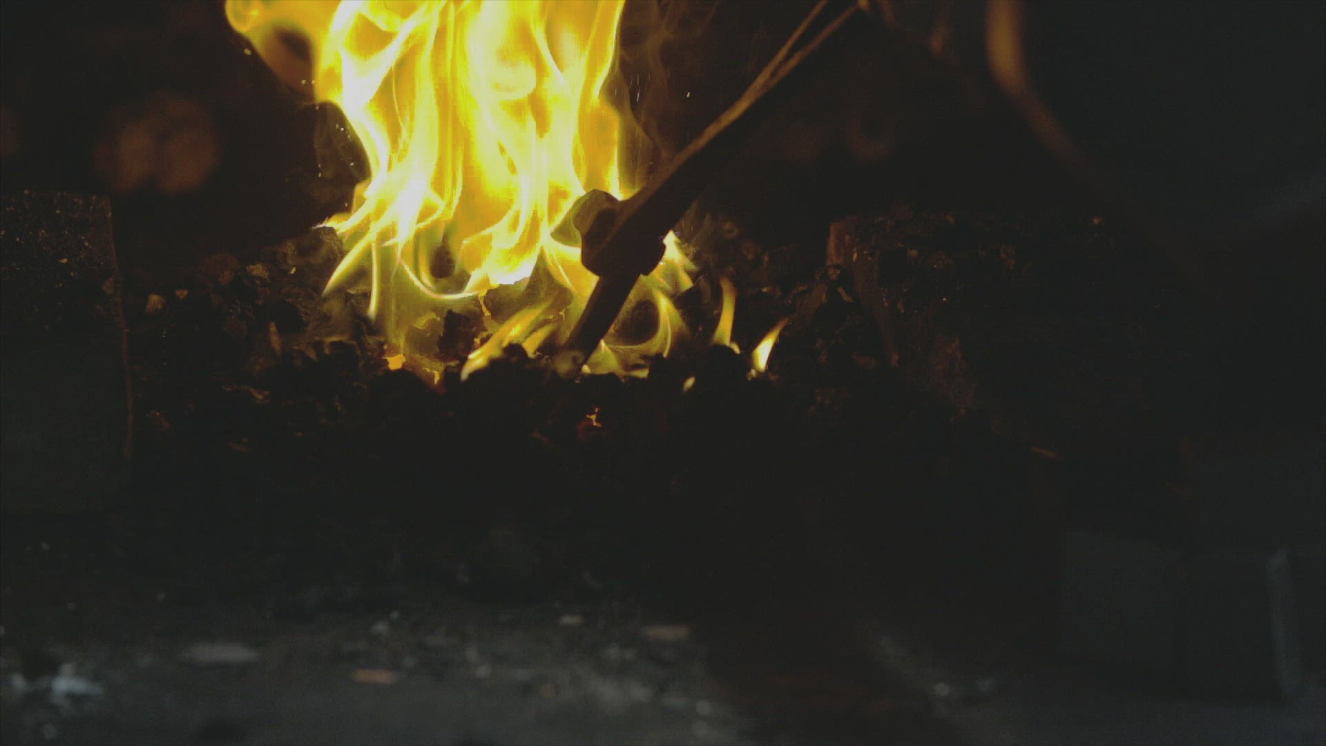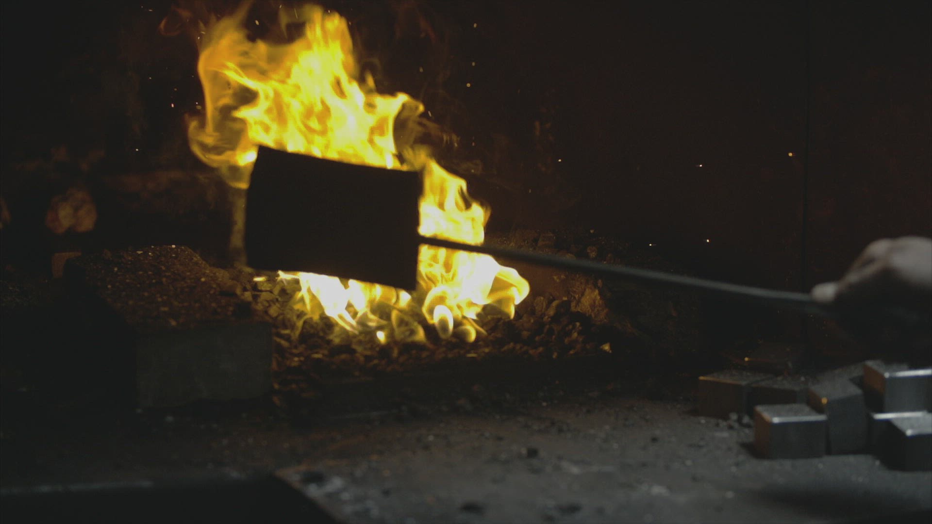 Blacksmith furnace with a hot iron, burning embers, sparks. Blazing furnace with burning coal at the blacksmith's. Blacksmiths make machete. 4K video, Philippines.