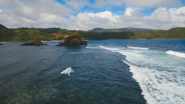 The coast of the tropical island with the mountains and the rainforest on a background of ocean with big waves.Aerial view: sea and the tropical island with rocks and waves. Seascape: sky, clouds, rocks, ocean. 4K video. Philippines, Puraran,Catanduanes. 4K video. Travel concept. Aerial footage
