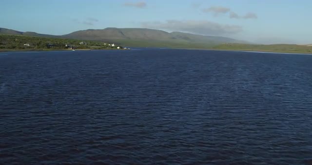 > Flying over a river towards a mountain