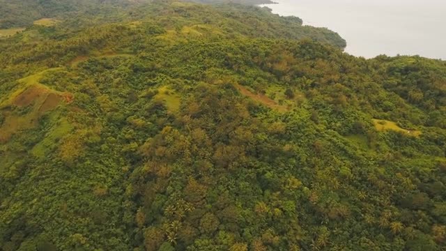 Mountains with rainforest covered with green vegetation and trees on the tropical island, landscape. Aerial view: Mountains and hills with wild forest. Hillside rainforest and jungle. Philippines, Catanduanes. 4K video. Aerial footage.