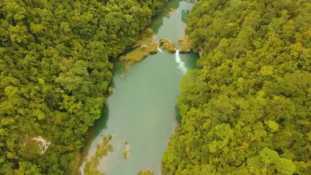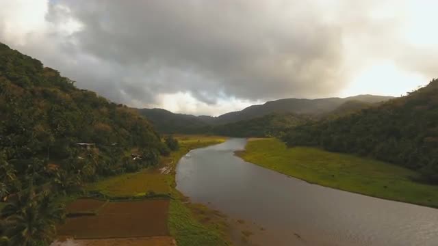 Aerial view: river and mountain, hills. Mountain river flows through green forest. Tropical river in the rain forest in Asia. 4K video. Aerial footage. Landscape.