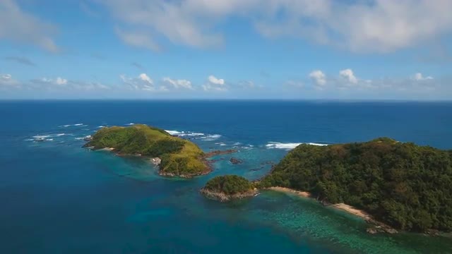 Aerial view:Tropical island with beach, mountains and the rainforest. Sea and the tropical island with rocks, beach and waves. Seascape: sky, clouds, rocks, ocean. 4K video. 4K video. Travel concept. Aerial footage. Philippines, Catanduanes