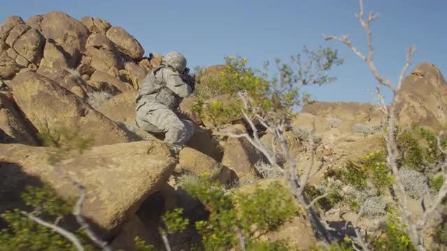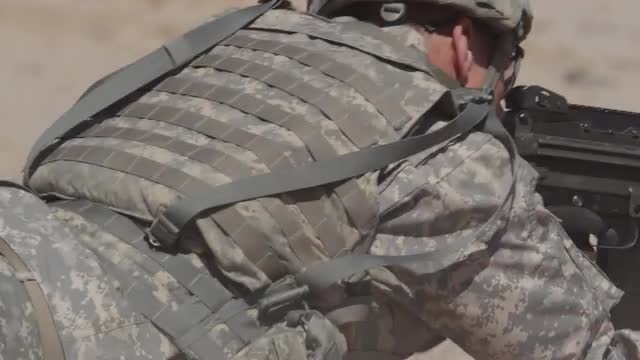 Soldier creating SMG fire with sunset in background
