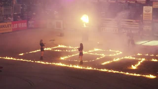 Bull riders in Vegas being introduced before an event. Includes girls, fireworks, riders, etc.