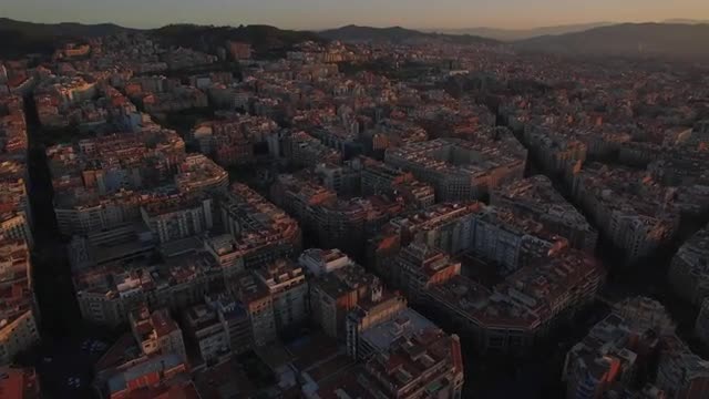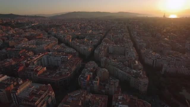 707369 - Flying over Barcelona and Sagrada Familia at sunset