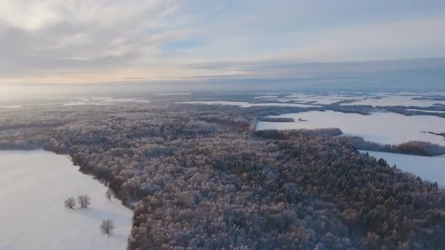 Winter forest, field. Aerial view: Winter landscape countryside, forest, field. Winter landscape, field, forest, trees covered with frost snow Aerial footage 4K video