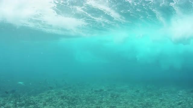 Surfer takes off on a large wave shot from down below. The wave barrels as it leaves the frame.