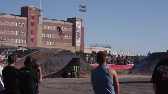 Slow motion shot of a motocross rider ripping a huge whip in front of University of Nevada Las Vegas. Footage is MOV transcoded from RED. Hand held.
