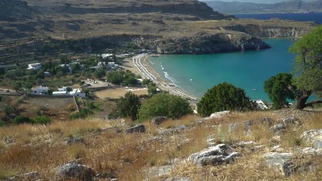 view from mountain over beach at Lindos, Rhodes, Greece