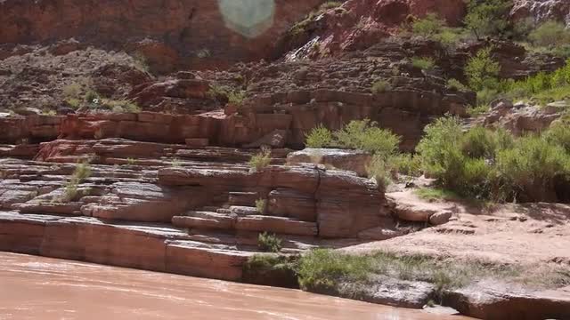 Head and shoulders of a male oarsman as he paddles a raft down the Colorado River through the Grand Canyon. Two other boats ahead int he distance.