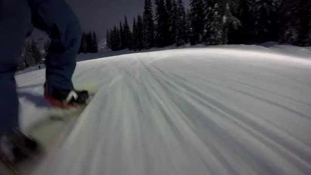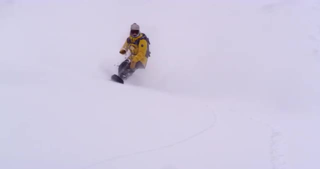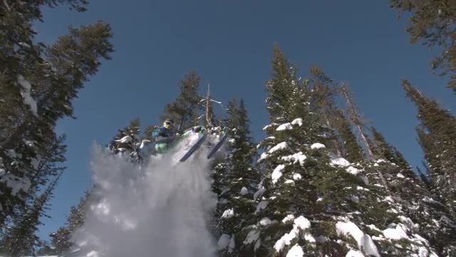 A male skier sprays powder at the camera in slow motion while backcountry skiing