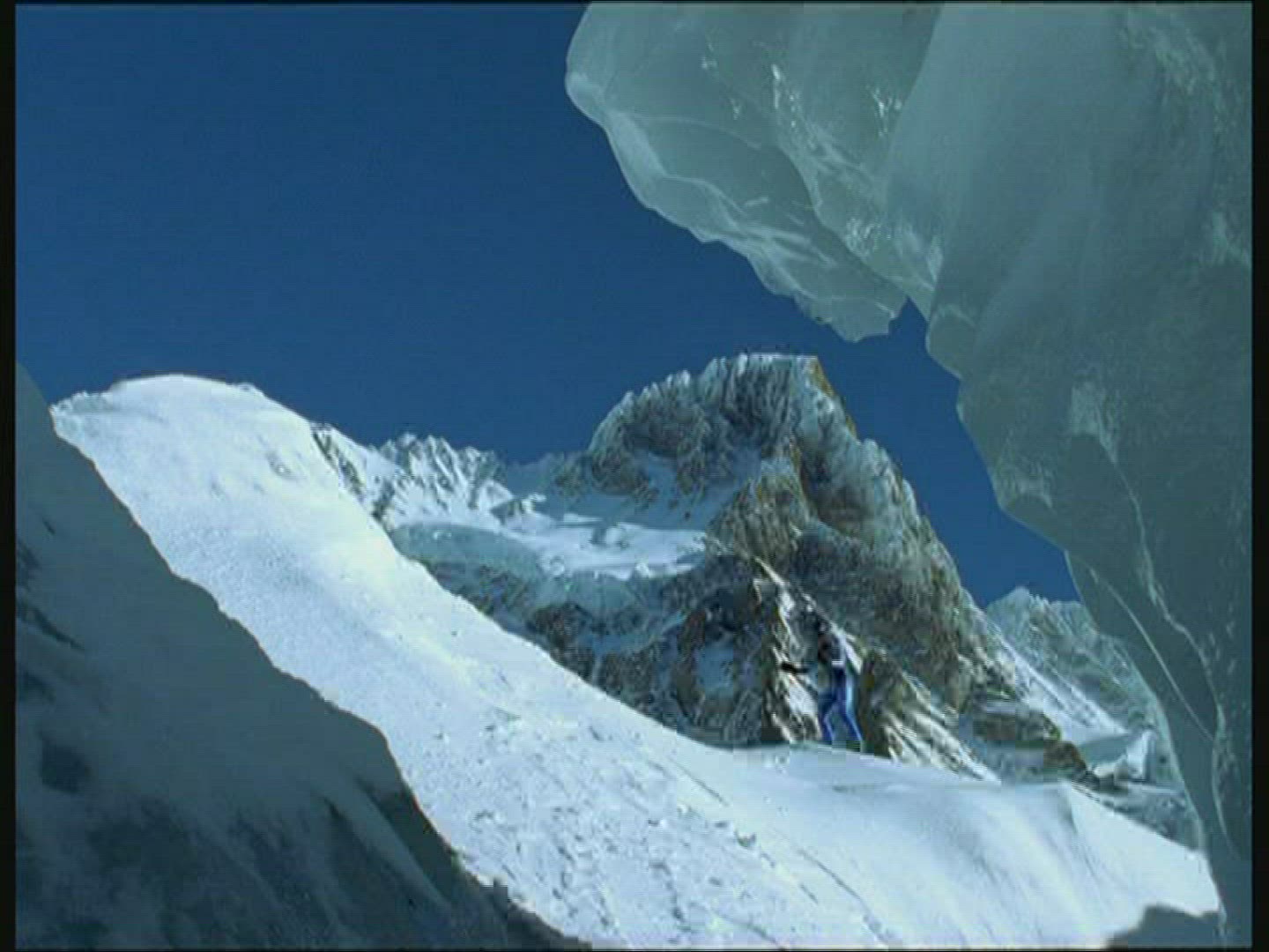 > Moving Past a Skier Close Up on the Skis in Slow Motion
