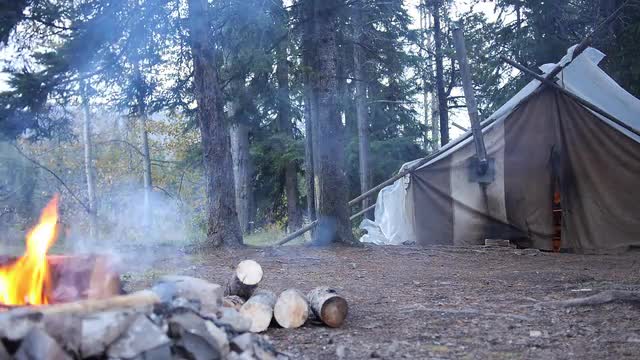 A campfire burns in front of a Hunters tent in the Canadion Rockies.