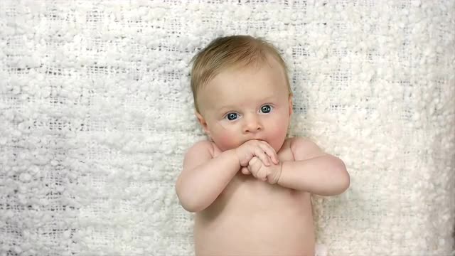 193712 - Birds eye view of a baby laying on its back and sucking its hand
