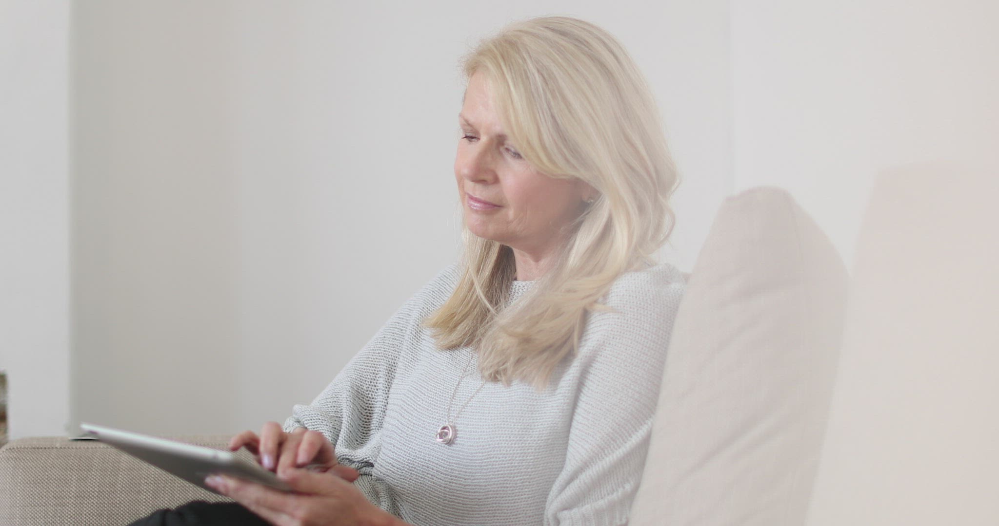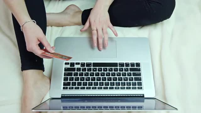 Beautiful woman shopping online with credit card using phone at home. Dolly Shoot. Connected banking app. Woman with smartphone and bank card indoors.