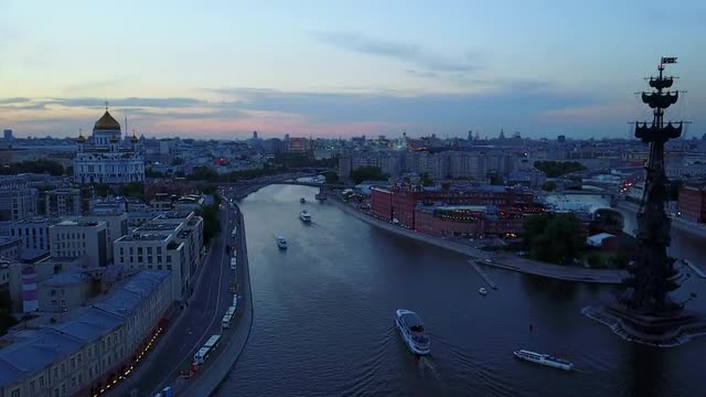 Moscow River and Bridge Aerial Night View From Drone